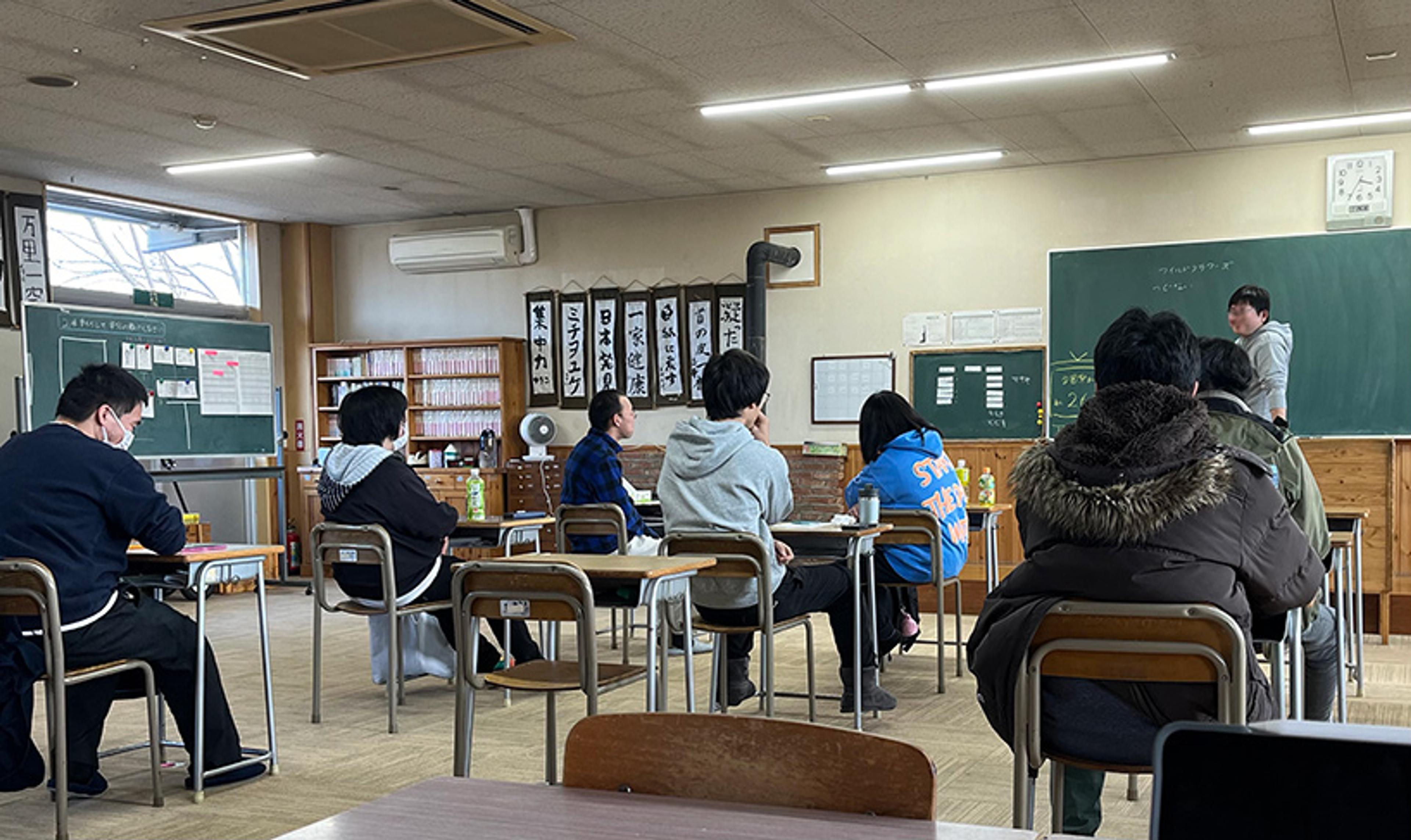 Inside, I met seven staff members sitting downstairs. Fumiko then led me upstairs to a ‘classroom’. As she slowly opened the door, I saw a young man – partly hidden behind a face mask and a bulky ski jacket – standing in front of a blackboard. Before him sat several people at small desks, each spaced about a metre apart, their backs turned toward us.